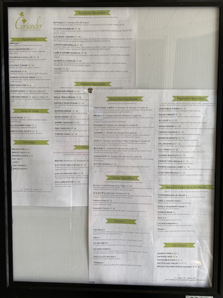 Coriander specializes in a rich variety of Indian dishes—each prepared with love and fresh ingredients that reflect the vibrant culinary traditions of India. Your journey begins with tantalizing vegetarian specialties such as Baingan Tikka Masala and Dal Tarka, both bursting with aromatic spices and flavors that transport you straight to India. For those craving something from the tandoor, the Tandoori Chicken and Malai Tikka Kebab promise succulence, perfectly marinated, and captivatingly smoky.